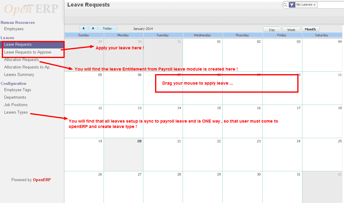 6. Execute the leave transactions (apply leaves, approve/disapprove leaves) at OpenERP.