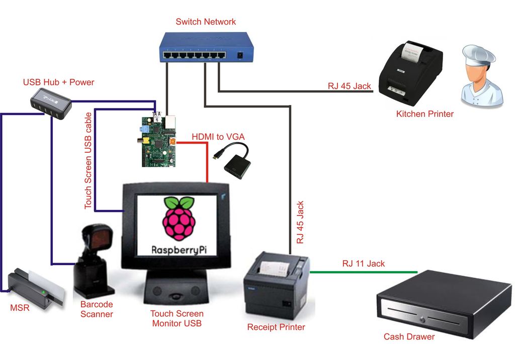 We call it Raspberry POS and it could connect to Receipt Printer, Kitchen Printer, Barcode Scanner, Magnetic Stripe Reader(MSR) or any device for a complete POS system. It act as Central Process Unit(CPU) by connecting and controlling all the devices which is cost-effective and provides amaizing user experience.